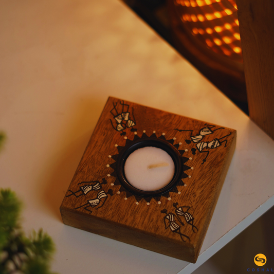 Warli Handpainted Wooden Tea-light Holder | Table Decor | Coshal | OD66