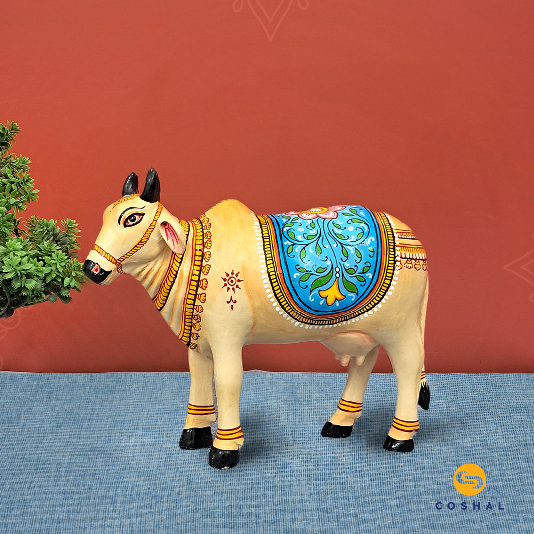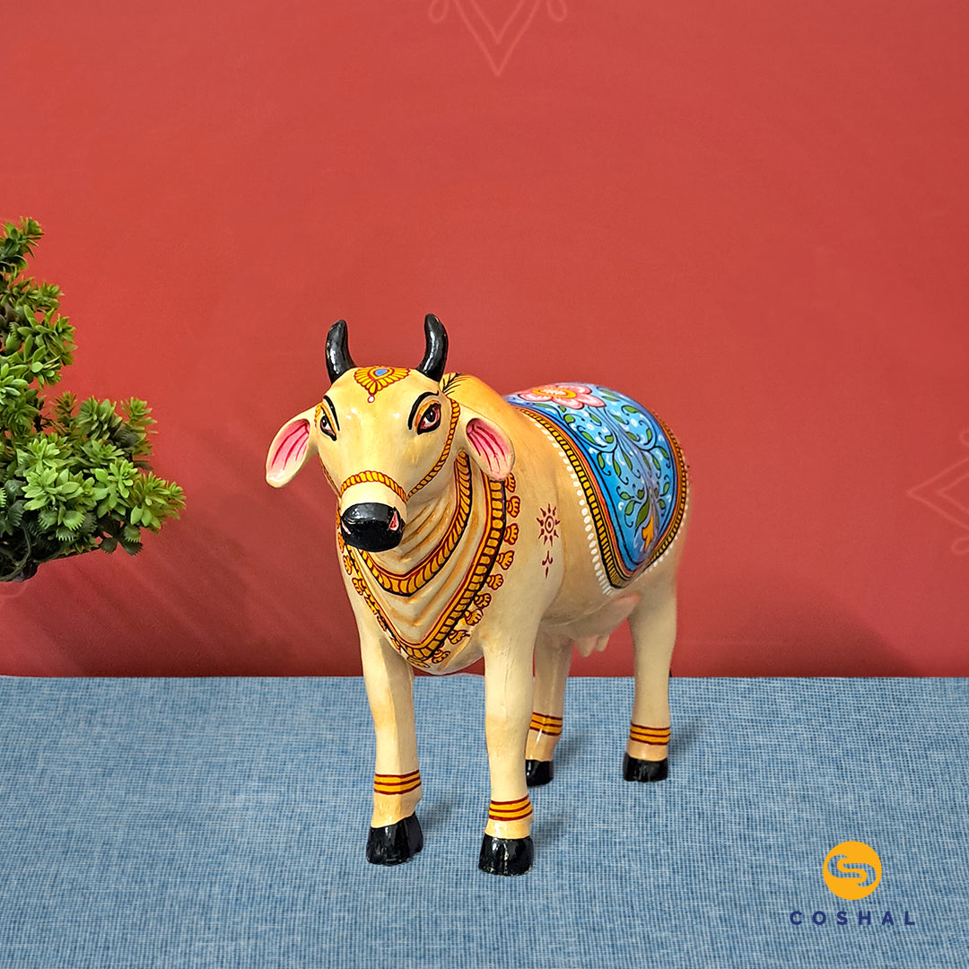 Discover divine grace with our Kamdhenu Cow, a wooden marvel hand-painted by tribal artisans of Odisha in the intricate Pattachitra art. Embrace auspicious Vastu vibes with this exclusive masterpiece, now available only at Coshal – Where Tradition Meets Artistry.